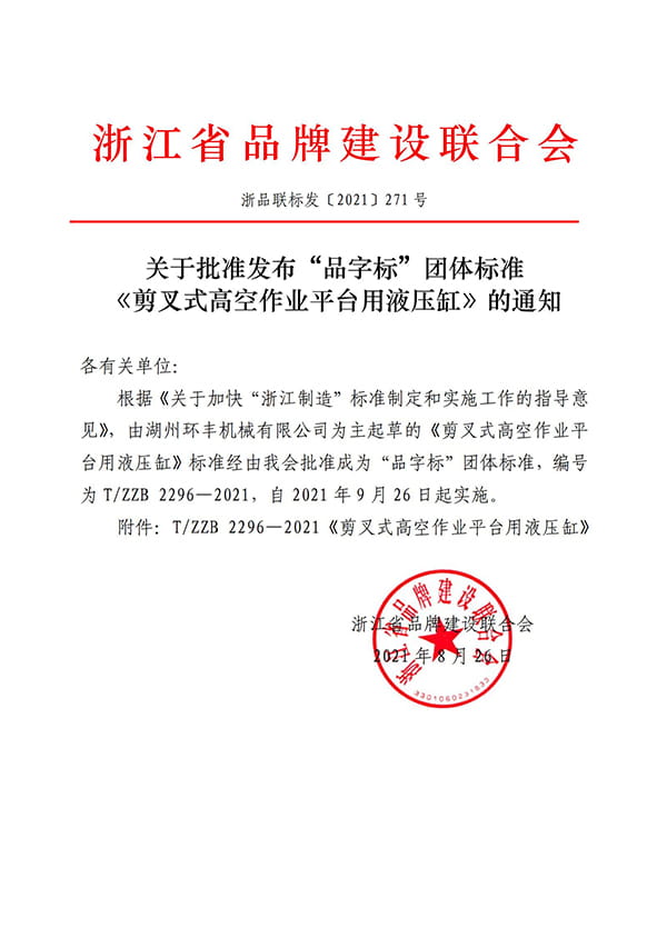 OBAVIJEST O odobrenju objave standardnih grupa "pinyibiao" "Hidraulički cilindar za zračne radne platforme za radno mjesto